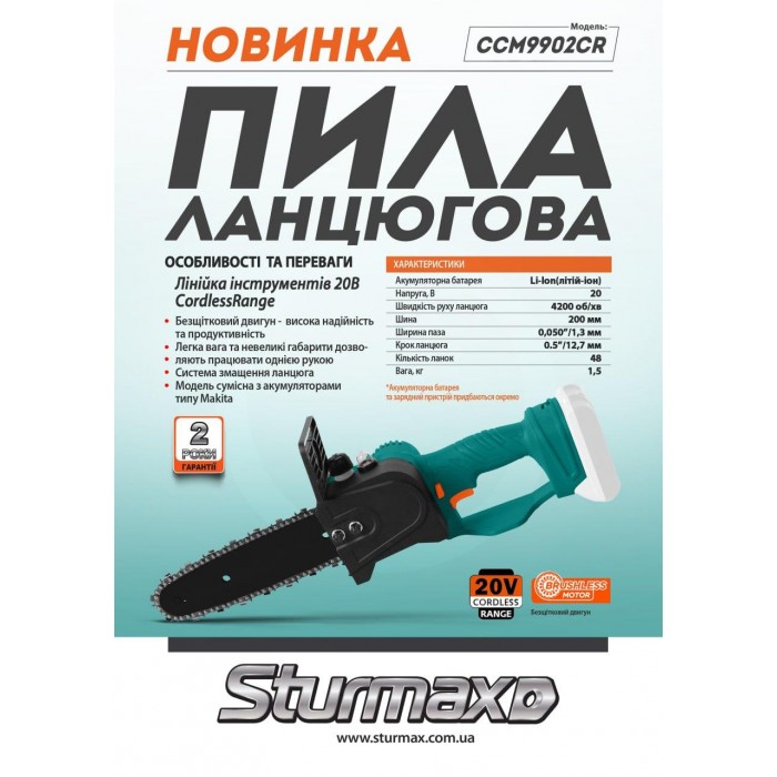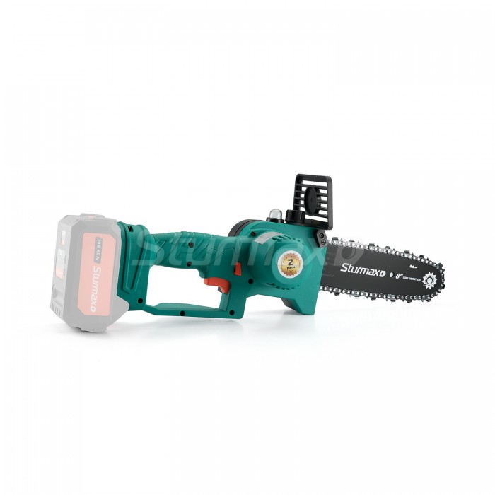 Sturmax CCM9902CR Brushless – аккумуляторная цепная мини-пила линейки инструмента под единственную 20В аккумуляторную платформу Sturmax Cordless Range. Пила имеет отличную эргономику, а благодаря компактным габаритам и небольшой массе, маневренная и легкая в использовании, в том числе, при работе в условиях ограниченного пространства. Корпус выполнен из качественного ударопрочного пластика и надежно предохраняет инструмент от возможных механических повреждений во время эксплуатации. Одна из важнейших конструктивных особенностей Sturmax CCM9902CR – мощный электромотор без щеточки – благодаря ему увеличивается устойчивость к перегрузкам и гарантируется лучшая производительность работы на одном заряде АКБ. Кроме того, такой мотор не подвержен перегреву и позволяет дольше работать без перерыва. Наличие системы смазки цепи с ручным подкачивающим насосом гарантирует долговечность пилочной гарнитуры, предотвращая ее перегрев и преждевременный износ. Для безопасности пользователя модель имеет защиту от случайного включения.