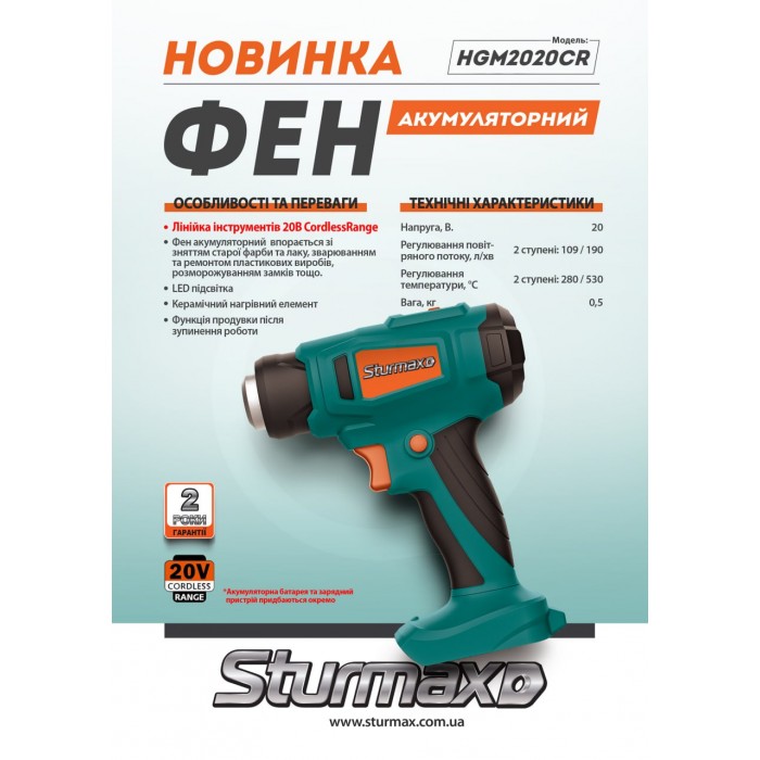 Sturmax HGM2020CR – аккумуляторный 20В технический фен линейки инструмента Sturmax Cordless Range под единую аккумуляторную платформу. Предназначен для выполнения широкого спектра задач: сушки поверхностей, удаление лакокрасочных покрытий, усадки термоусадочных трубок, формовка материалов и т.д. Модель имеет два режима работы, что обеспечивает гибкость использования: 1) температура нагрева 280 °C при скорости воздушного потока 109 л/мин; 2) температура нагрева 530 °C при скорости воздушного потока 190 л/мин – это позволяет подбирать оптимальные параметры при работе с разными материалами. Для большего комфорта работы в условиях с недостаточным освещением фен оснащен эффективной подсветкой рабочей зоны WorkingLight. Компактные габариты инструмента и его небольшой вес и тщательно проработанная эргономика способствуют удобству применения даже в труднодоступных местах. В комплект Sturmax HGM2020CR входят три насадки, расширяющие область применения устройства.