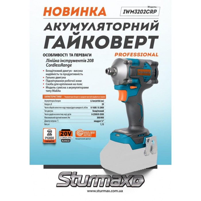Sturmax IWM3202CRP Professional – аккумуляторный 20-вольтовый гайковерт из линейки инструмента Sturmax Cordless Range под единую аккумуляторную платформу с патроном HEX Type (наружный квадрат 1/2" и внутренний шестигранник 1/4"). Предназначен для выполнения задач по закручиванию и откручиванию болтов, гаек и других крепежных элементов. Модель имеет современный, стильный дизайн и отличную эргономику: благодаря своим минимальным габаритам и нейтральному центру притяжения гайковерт прекрасно лежит в руке, максимально удобен во время работ в условиях с ограниченным доступом. Дополнительному комфорту хвата способствует прорезиненная рукоять. Важной особенностью модели Sturmax IWM3202CRP является наличие бесщеточного электромотора – он демонстрирует повышенную устойчивость к перегрузкам и обеспечивает лучшую производительность работы на одном заряде АКБ, кроме того, такой мотор не подвержен перегреву, и позволяет дольше работать без перерыва. Предусмотрены два режима работы: 1-я скорость (0 – 1600 об/мин, макс крутящий момент – 300 Н м, 2-я скорость (0 – 2400 об/мин, макс крутящий момент – 400 Н м) – в зависимости от необходимости пользователь может выбирать наиболее оптимальный. в условиях с недостаточным освещением. Для удобства крепления на поясе на корпусе имеется прочная металлическая скоба.