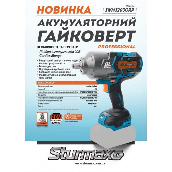 Внимание! Комплектация гайковерта Sturmax IWM3203CRP не включает в себя аккумулятор, зарядное устройство, кейс.