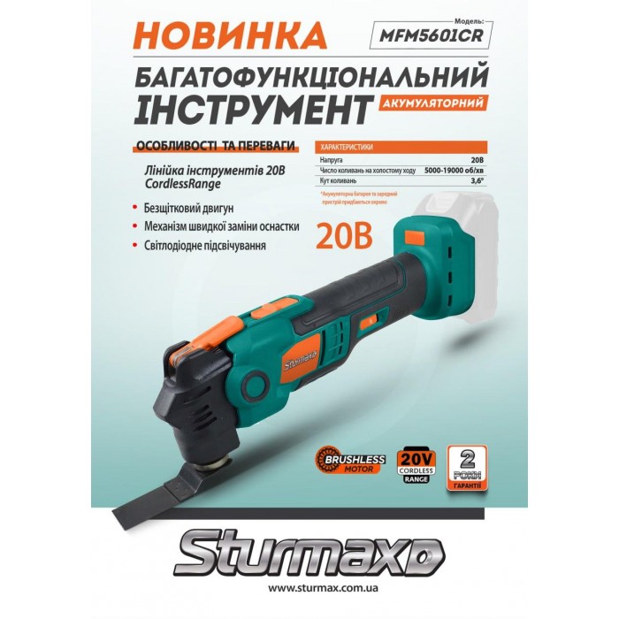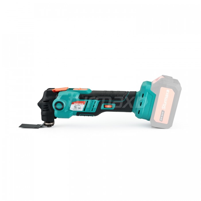 Sturmax MFM5601CR – многофункциональный аккумуляторный 20В реноватор линейки инструмента Sturmax Cordless Range под единую аккумуляторную платформу – надежный помощник при ремонтных и монтажных работах. Инструмент способен выполнять широкий спектр задач по резке, шлифовке, полировке различных материалов, включая дерево, металл, пластик, керамику. Компактные габариты реноватора позволяют его уверенно использовать в условиях с ограниченным доступом. Корпус устройства выполнен из крепкого пластика и имеет резиновые накладки для надежности хвата. Одна из самых важных особенностей Sturmax MFM5601CR – бесщеточный электромотор – благодаря ему увеличивается устойчивость к перегрузкам и обеспечивается лучшая производительность работы на одном заряде АКБ. Кроме того, такой мотор не подвержен перегреву и позволяет дольше работать без перерыва. Предусмотрена функция регулировки скорости колебаний в широком диапазоне от 5000 до 19000 кол/мин, что помогает подобрать оптимальный режим работы в зависимости от используемой оснастки и обрабатываемого материала. Закрепление оснастки на инструменте производится с помощью быстрозажимного механизма. Для удобства работы в условиях недостаточного освещения реноватор имеет эффективную LED подсветку рабочей зоны.