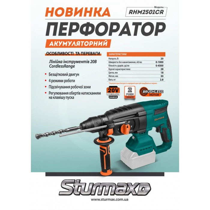 Sturmax RHM2501CR – легкий и компактный аккумуляторный перфоратор 20В линейки инструмента Sturmax Cordless Range под единую аккумуляторную платформу. Предназначен для бурения и долбления различных строительных материалов: бетона, кирпича, камня и т.д. Благодаря оптимальной компоновке модель отлично лежит в руках, выверенные массогабаритные показатели способствуют лучшему контролю инструмента даже при работе с тяжелым доступом, а отсутствие привязки к электросети значительно повышает маневренность. Важной особенностью Sturmax RHM2501CR является наличие мощного электромотора без щеточки – за счет него увеличивается устойчивость к перегрузкам и обеспечивается лучшая производительность работы на одном заряде АКБ. Кроме того, такой мотор не подвержен перегреву и позволяет дольше работать без перерыва. Перфоратор имеет три рабочих режима: сверление, сверление с ударом и удар – пользователь может выбрать наиболее подходящий для конкретной задачи. Предусмотрена LED подсветка рабочей зоны, что позволяет эффективно использовать инструмент в условиях недостаточного освещения.